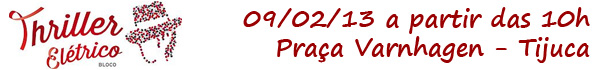 | 12/jan/13 - 18:30 | Bloco Virtual (Não oficial) | Praça Almirante Julio de Noronha | Leme | - | - | - | |||
